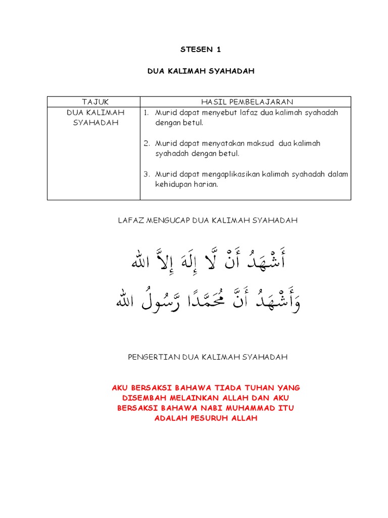 Dapat dilihat juga pada halaman 18 kalimah syahadah pertama dikaitkan dengan jalan peperangan dan keganasan. Nyatakan erti Dua Kalimah Syahadah. Oleh karena itu dalam satu hari semalam umat Islam wajib membaca dua kalimat syahadat minimal 5 kali di dalam 5 shalat waktu.